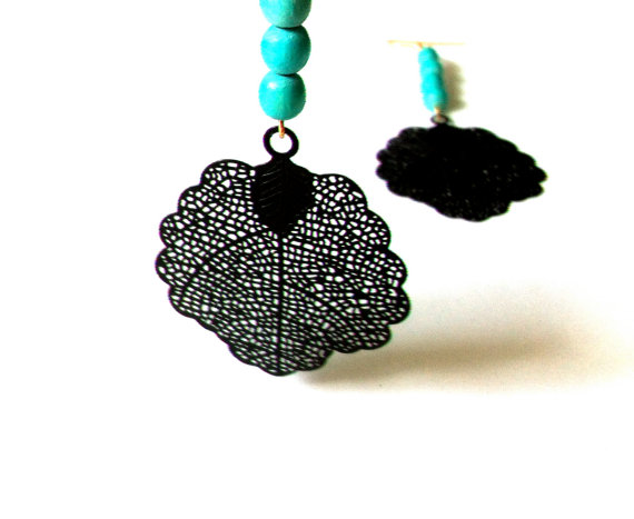 Hard and soft is what I was going for with these earrings. Black metal lace leaf and spots of spring, it's perfect.